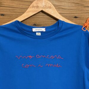 T-SHIRT BIMBA/O – 9/10 ANNI Colore Blu “VIVO ANCORA CON I MIEI” ricamo rosso