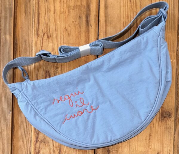 BORSA TRACOLLA AZZURRA ” SEGUI IL CUORE” ricamata a mano