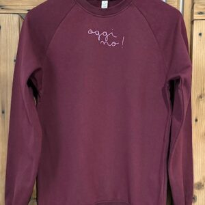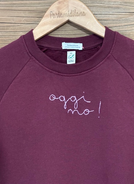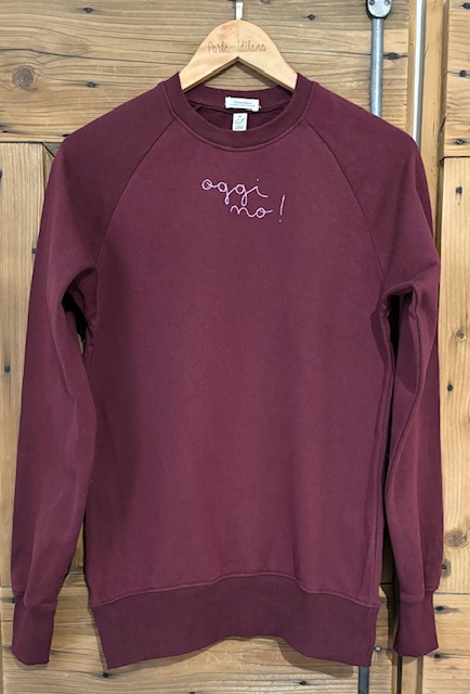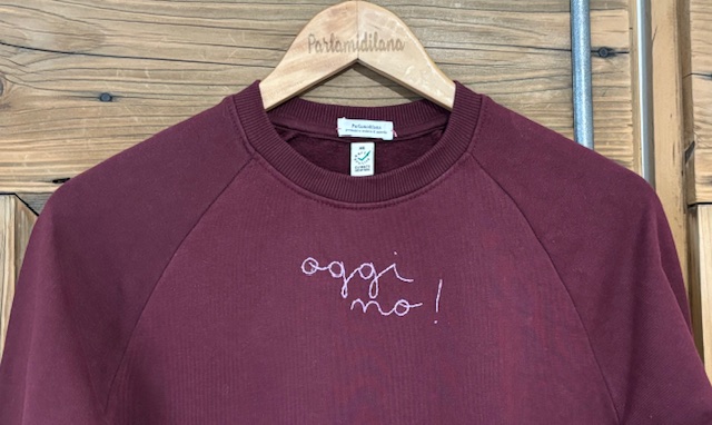 FELPA UNISEX XS – “OGGI NO!” (Colore bordeaux) ricamata a mano. Vedi tabella TAGLIE in galleria foto.