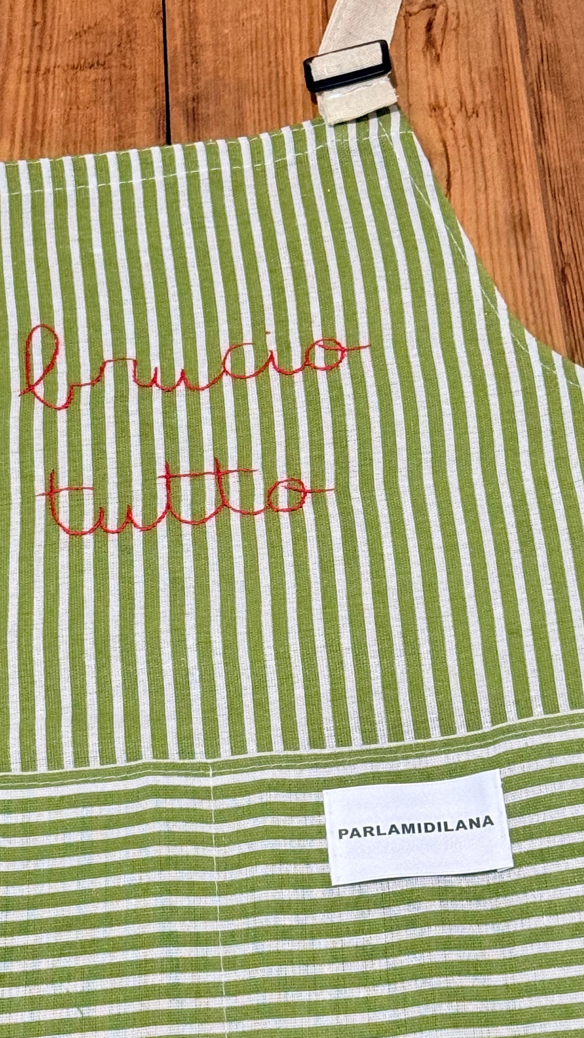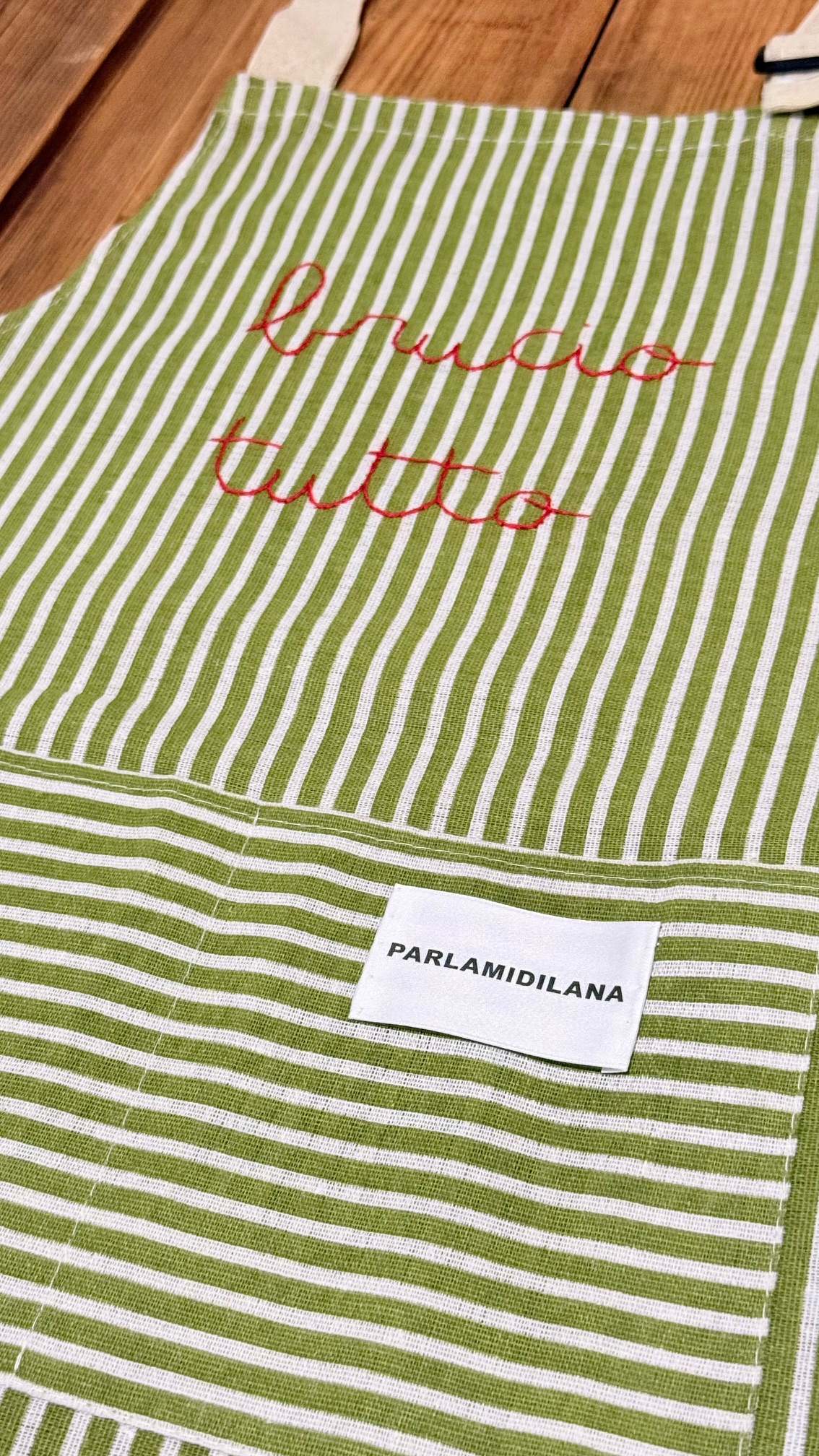 GREMBIULE A RIGHE VERDE SALVIA/BIANCO “BRUCIO TUTTO”