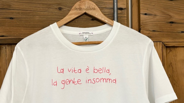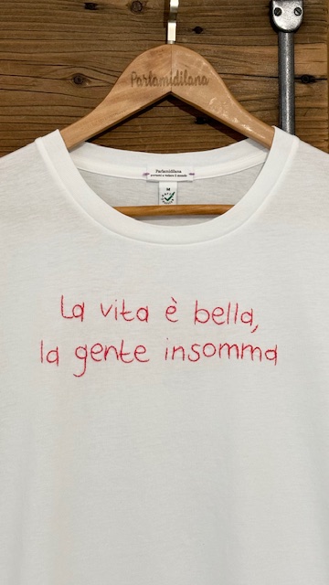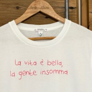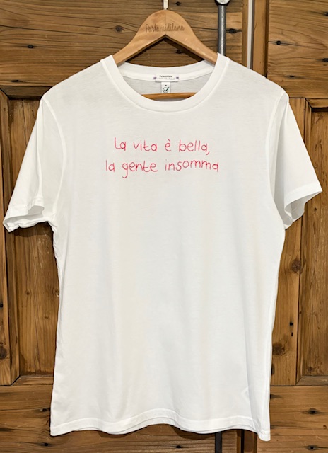 LA VITA E’ BELLA, LA GENTE INSOMMA – M UNISEX BIO (Bianca) ricamata a mano 100% cotone BIO.