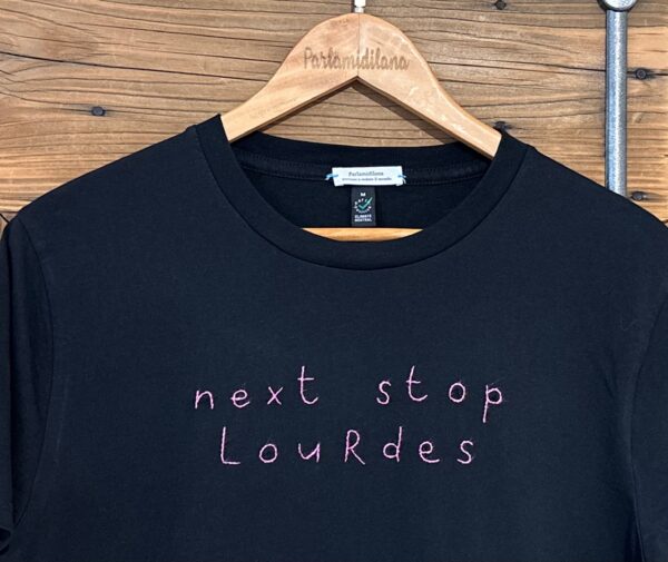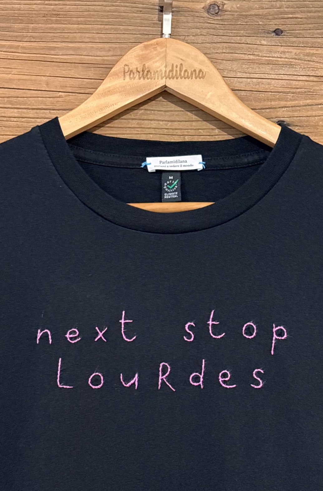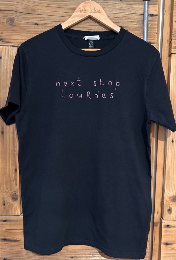NEXT STOP LOURDES – M UNISEX BIO (Nera) ricamata a mano 100% cotone BIO.