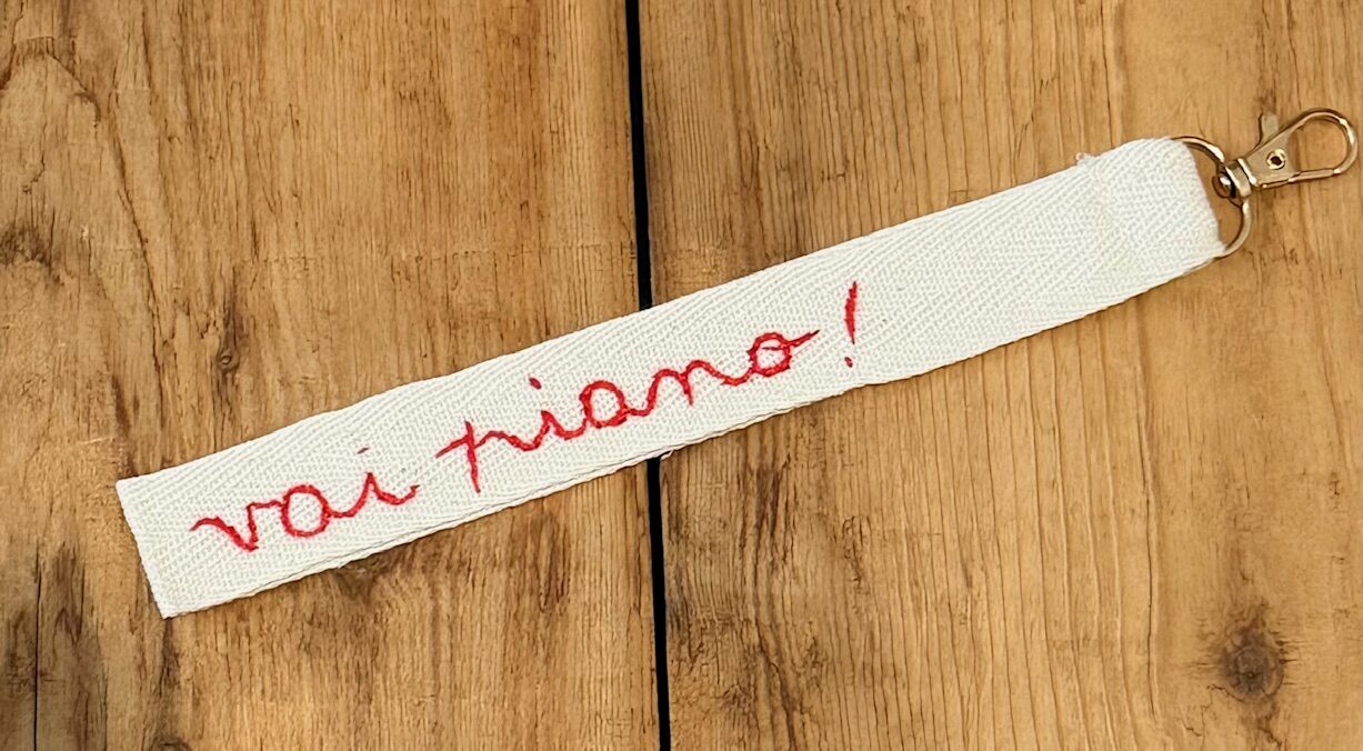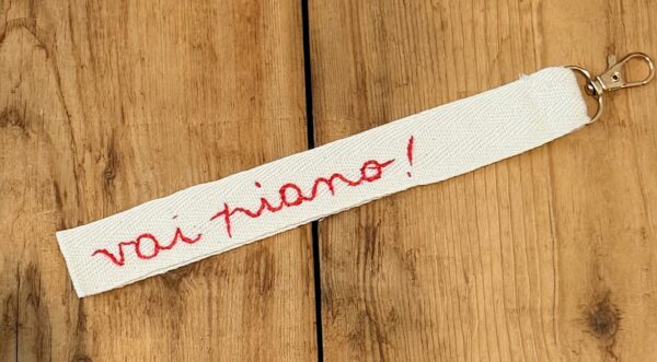 Portachiavi in fettuccina ricamato a mano con moschettone in metallo.