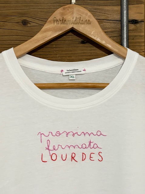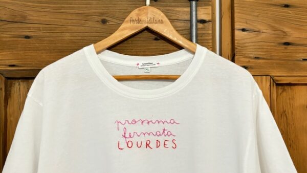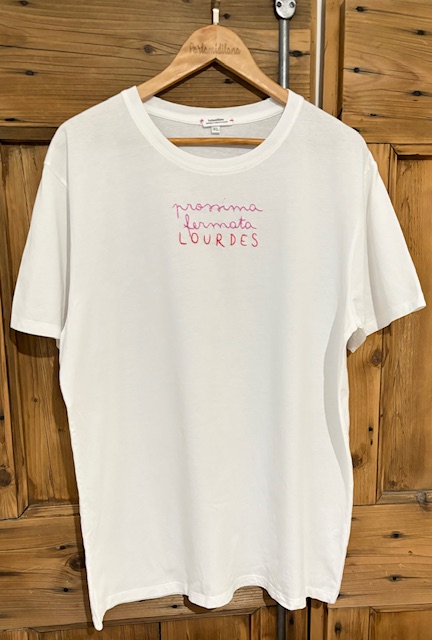 PROSSIMA FERMATA LOURDES – XL UNISEX BIO (Bianca) ricamata a mano 100% cotone BIO.