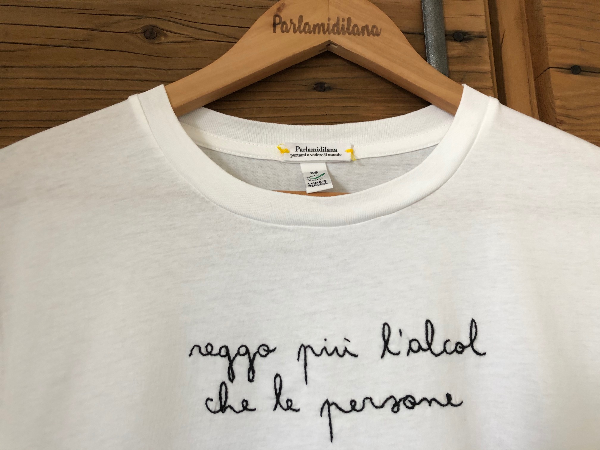 Tag: 100% cotone BIO, alcol, BIO, bio certificato, made in trentino, parlamidilana, reggo più l'alcol che le persone, ricamata a mano, ricamo a mano, t shirt 100% cotone BIO, tshirt